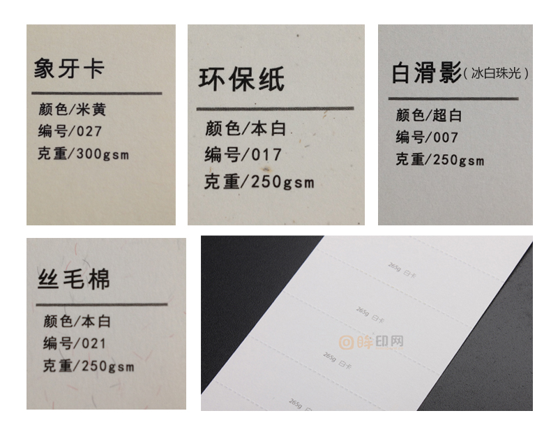 材质说明:色彩还原显象度高,立体感强,光泽靓丽,同时具有艺术纸的质感,手感突出。外观上看:白卡纸细腻平滑,莱尼纸有横竖条纹,刚古纸有水波样条纹,经典之恋米白荧光效果,冰白珠光白色荧光效果,丝毛棉里面有不同颜色线条,象牙卡米色细腻平滑,环保卡里面有杂质样斑块。